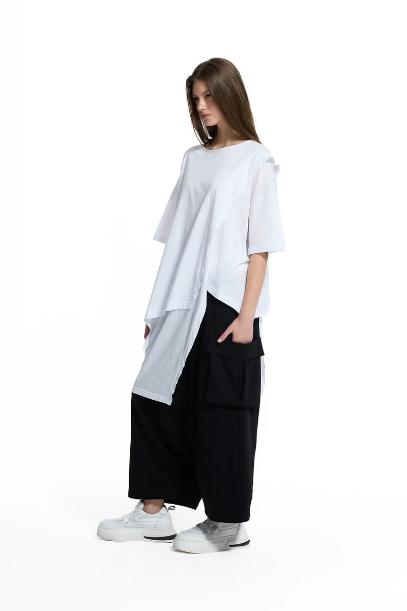 Disponível em diversas cores, esta túnica não só oferece conforto, mas também um toque de classe e originalidade ao seu visual. A sua silhueta fluida realça a feminilidade, enquanto as linhas assimétricas acrescentam um elemento de interesse sem esforço.